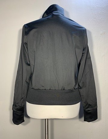 Adidas jacket. Black and white colouring. Closes with a zipper along the front of the jacket. Has pockets on the front of the jacket.