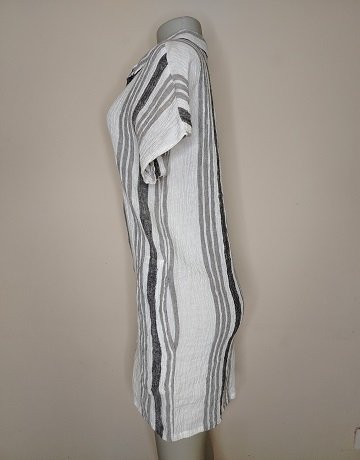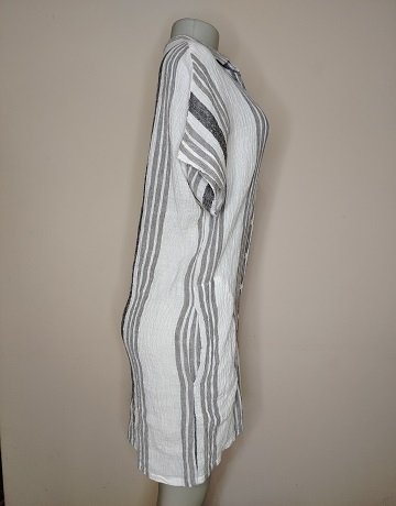 White and Grey Striped Button-down Dress from Amanda Laird Cherry. Size – SA36. Short cut-on sleeves. Collared. Two front in-seam pockets. Knee-length. Textured, cotton-blend fabric. Easy to wear dress in excellent condition.