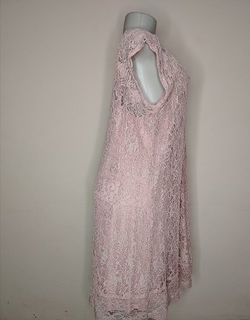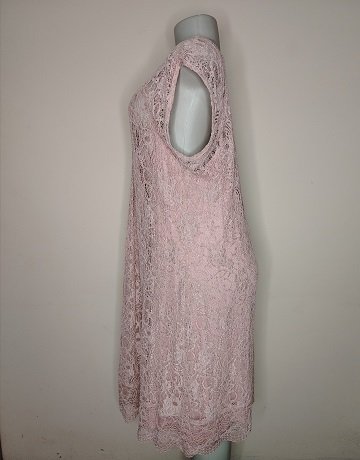 Dusty Pink Lace 2-Piece Dress from Amanda Laird Cherry. Size – SA40. Sleeveless. Scooped neckline. Loose fitting. Seperate Camisole Dress serves as lining. Viscose fabric blend. Beatifull feminine dress in excellent condition.