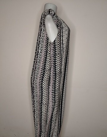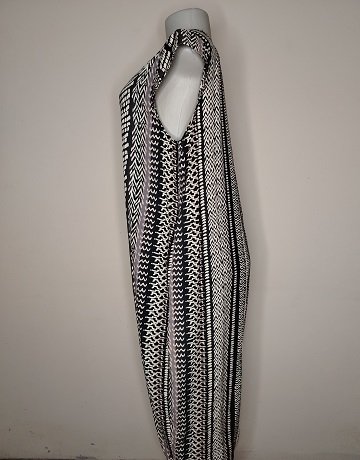 Black, Cream and Grey jumpsuit from Amber. Size – Medium. Viscose fabric. Inseam pockets. Cap sleeves. Scoop neckline. Zipper centre back. Long legs Elasticated. Garment in great condition.