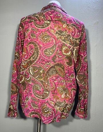 Bam Bam shirt. Pink, green, grey and white colouring. Patterned. Closes with buttons along the front of the shirt. Good condition.