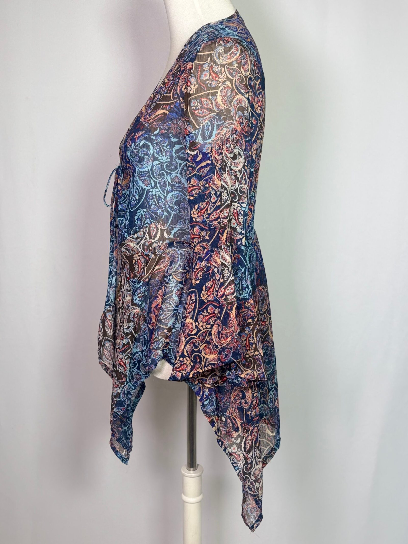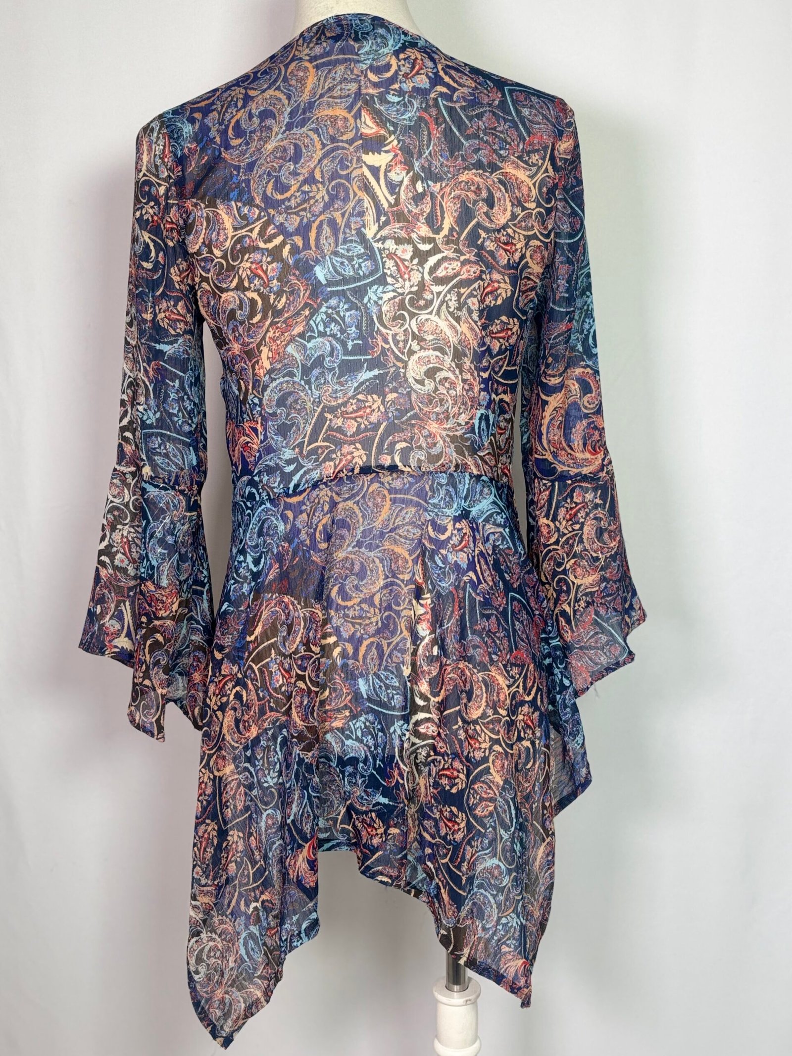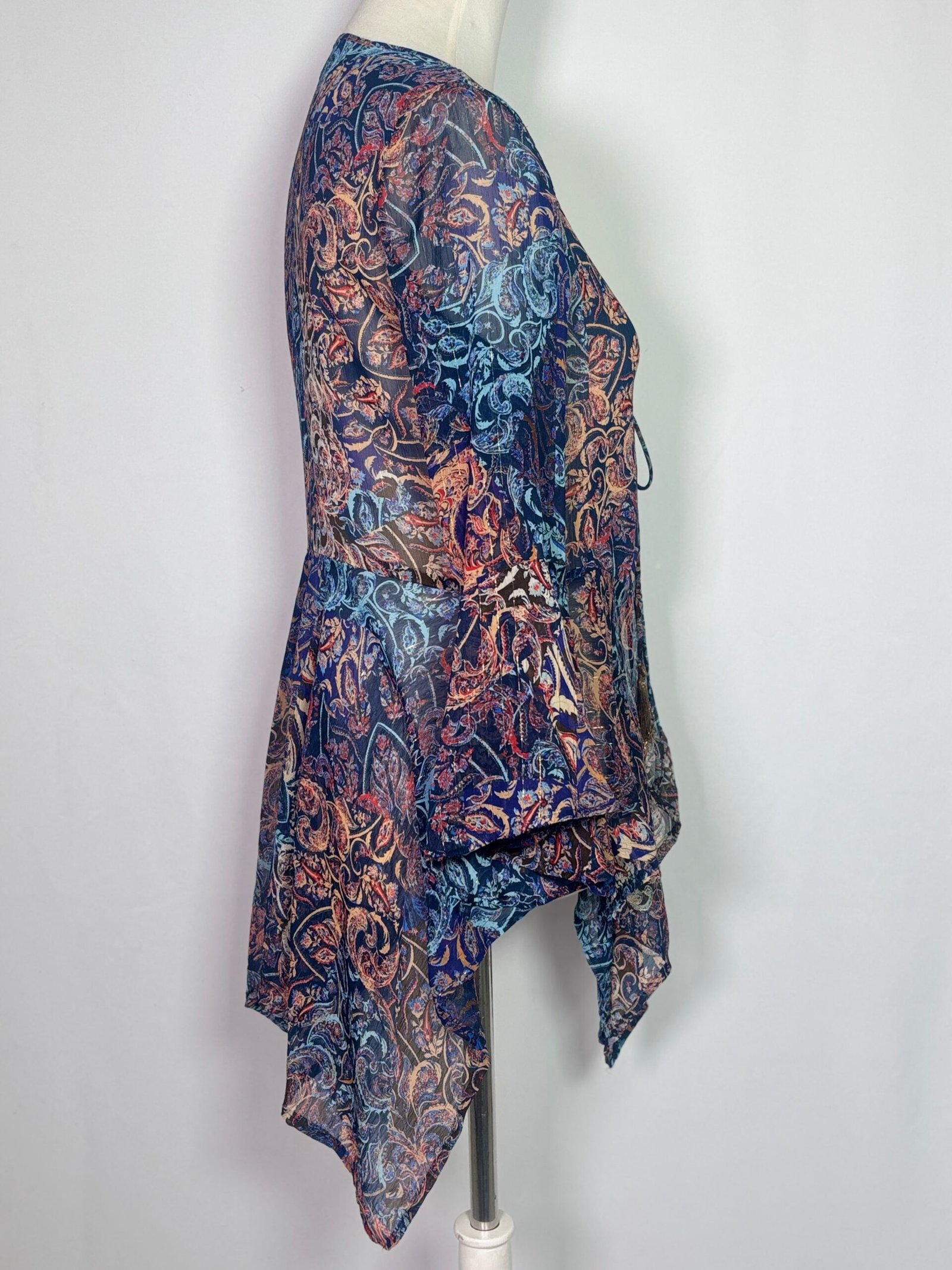 Beautifully patterned kimono-style top featuring a vibrant design and flowing sleeves, perfect for layering over outfits.