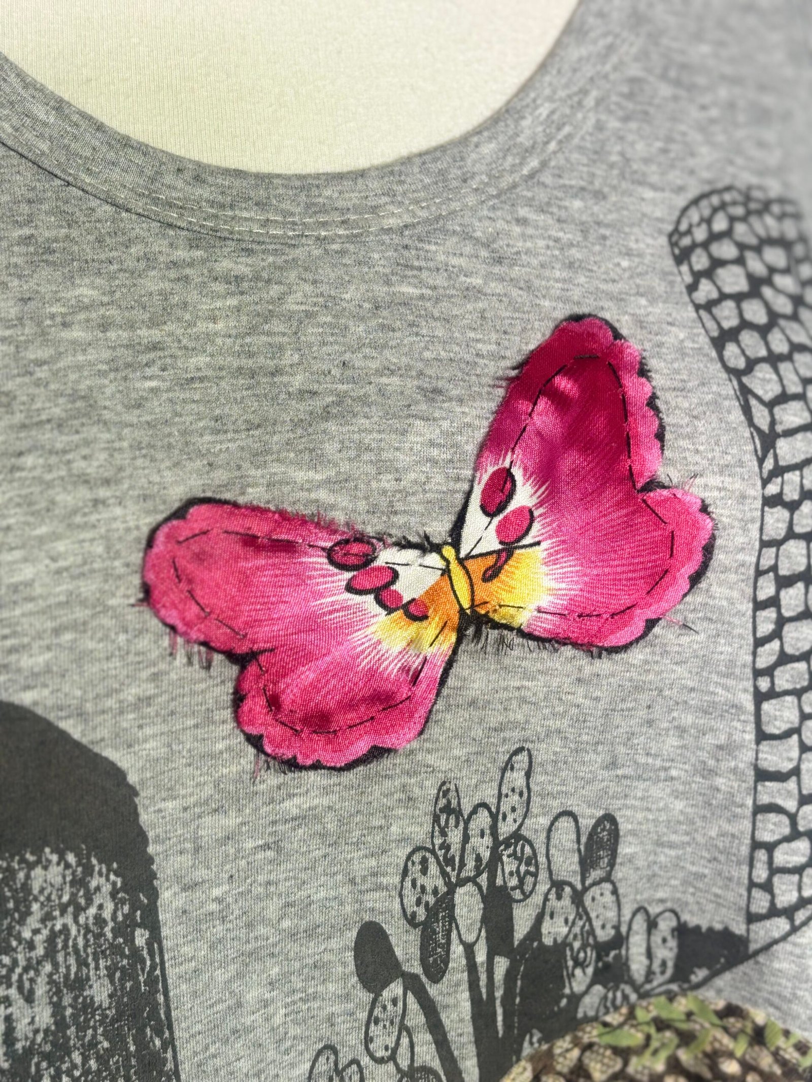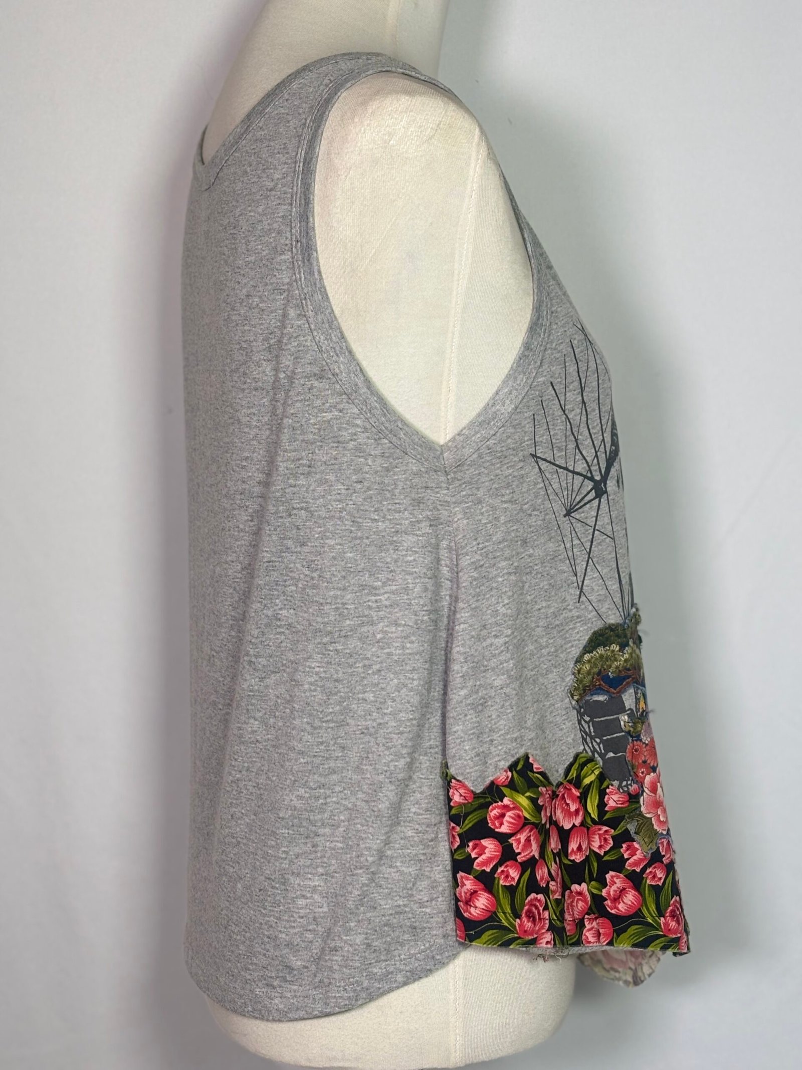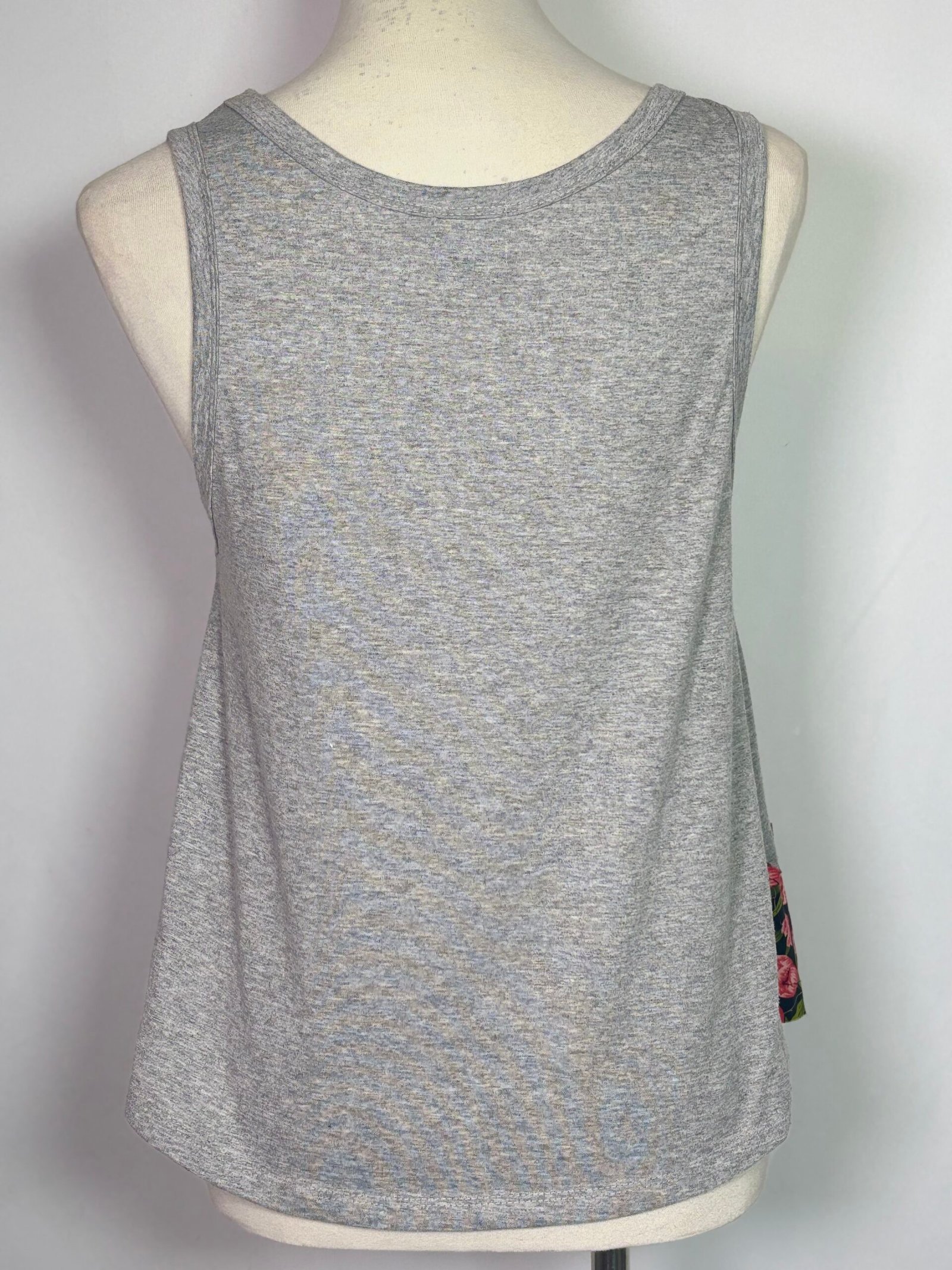 Fun and vibrant grey tank top featuring a unique butterfly design and floral patterns, perfect for casual outings.