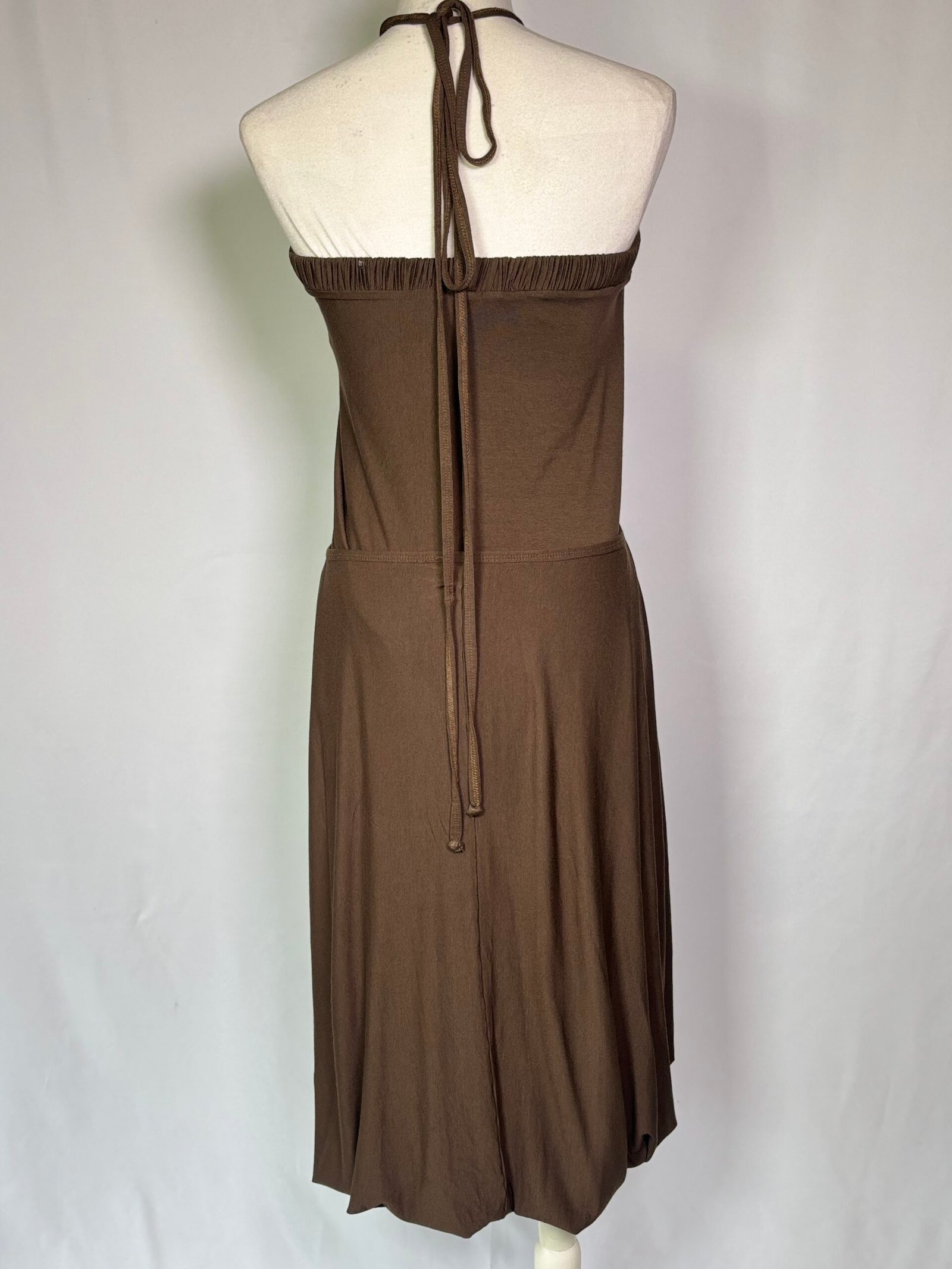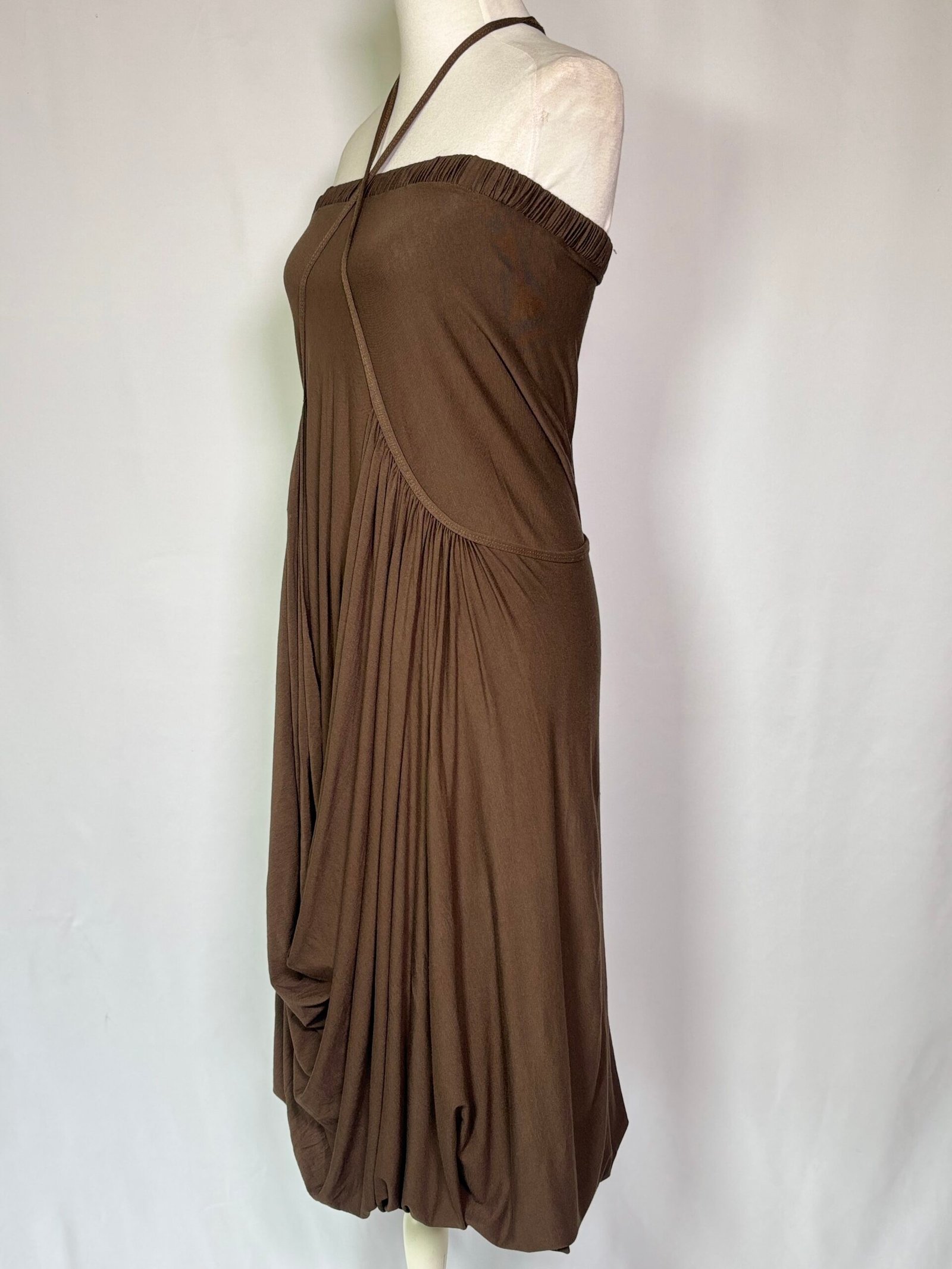 This stylish strapless dress features a unique draped design in a rich brown color, perfect for a casual day out or a relaxed evening.