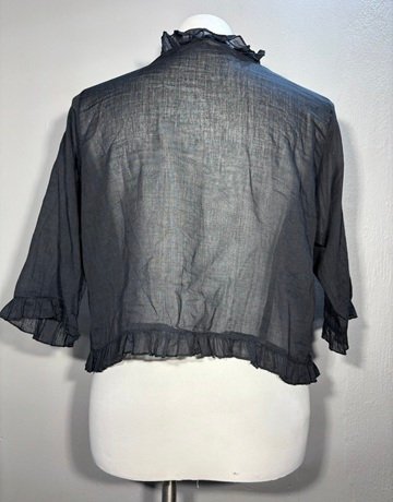 Light jacket. Black colouring. Cotton fabric. Closes at the front of the jacket. Good condition.