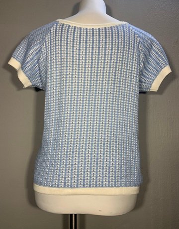 Blue and white colouring. Short sleeves. No brand name. No fabric label. Good condition.