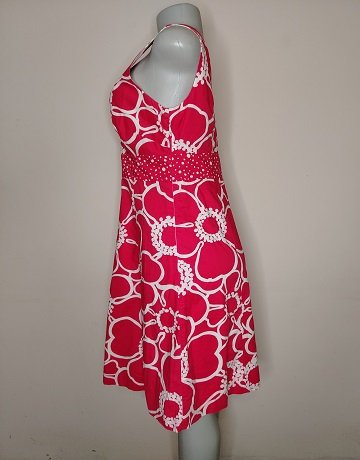Red and Cream Dress from Boden. Size – UK10. 100% Cotton fabric. Lined in Cotton. Draped front bodice. Banded waistline. Large Floral print. Deep V-neckline front and back. Sleeveless. Knee length. Invisible zipper on the side. Stunning dress in excellent condition.