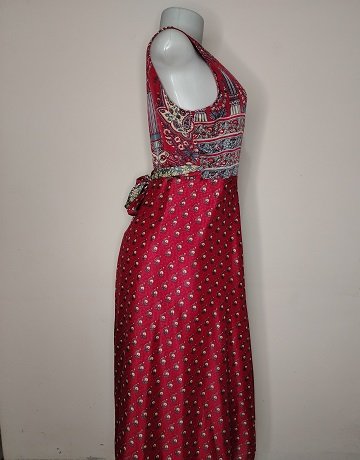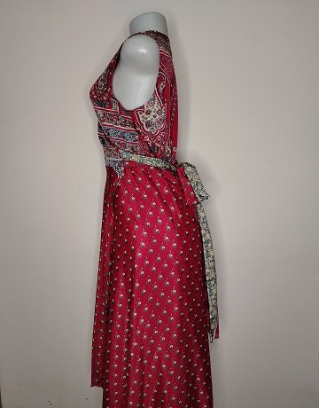 Cranberry coloured Wrap Dress and Pettycoat from Carol Clark. Size – SA36. Front wrap with deep v-shaped neckline. Sleeveless. Paisley print on cranberry coloured background. Cream and Blue accents. Curved hemline. Below the knee. Includes Mesh Pettycoat. Garments are in excellent condition.