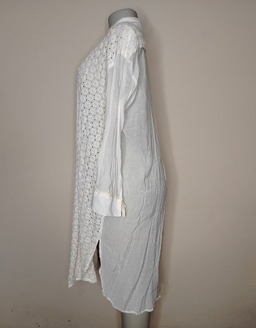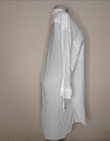 Milk/Cream Eyelet Buttondown Shirt Dress/Tunic from Coco & Salt Africa. Size Medium. Long, sheer sleeve with ribbon tie. One breast pocket. Collared. Gold metal buttons. Midi dress length. Curved hemline. Sheer Polyester Eyelet fabric. Feminine Dress in excellent condition.