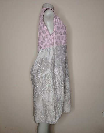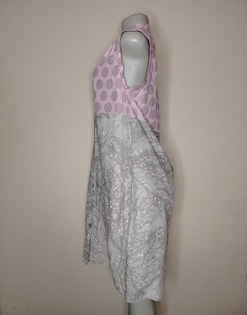 Pink & Grey Shirt Dress from Colleen Eitzen. Size – SA32. 100% Cotton. Sleeveless. Collarless. Button-through. Loose Shift style. In-seam pockets. Butterfly and Botanical print. Feminine garment in excellent condition.