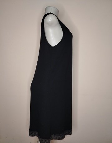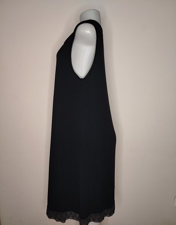 Black Cotton-knit Dress COS. Size – Medium. Round neckline. Sleeveless. Lace trimmed hemline. Swing dress shape. Inverted front pleat. Loose fitting dress in great condition.