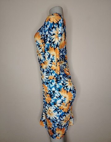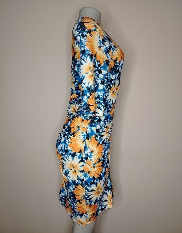Blue, Orange and Black Dress from Crave. Size – Medium. Three quarter length sleeves. Round neckline. Ruched front and back detail. Knee length. Soft Jersey Knit fabric. Garment in good condition.