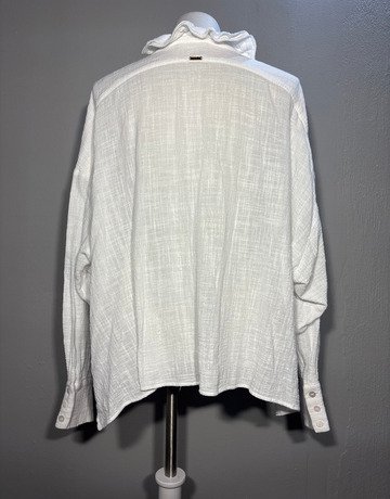 Desray top. White colouring. 100% Cotton fabric. Closes with buttons along the front of the top. Has frill detailing.