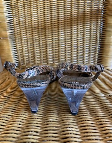 Errol Arendz heels. Brown and black colouring. has a round, open toe. Has adjustable straps.