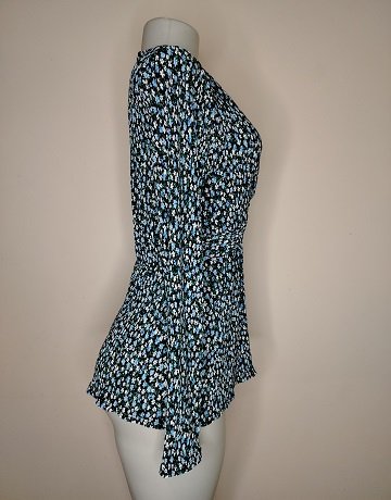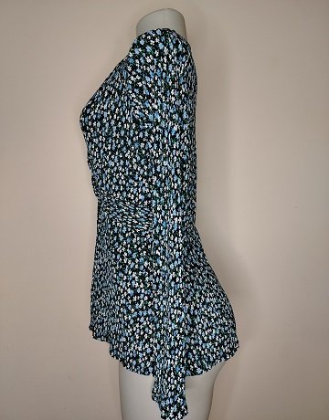 Black, Blue and White Blouse from F&F. Size – UK12. Long sleeved. Draped neckline, draping into waistline. Small Floral print. V-shaped neckline. Polyester/Elastane fabric mix. Feminine Top in excellent condition.