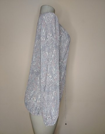 Paisley-print Chiffon Blouse from Forever New. Size – UK10. Features a v-neckline with tie-front detail. Light Grey/Blue paisley print. Lightweight, sheer chiffon fabric. Balloon-style sleeves and elasticated cuffs. Peasant-style. Elasticated waist/hem. Garment is in great codntion.
