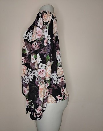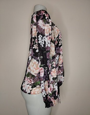 Black Blouse with Pink & Cream Rose and Green Leaves from Forever New. Size – UK10. Long sleeves with elastic cuffs. Round neckline. Button and Loop closure centre back. Front Tie detail at hemline. Polyester fabric. Feminine garment in excellent condition.