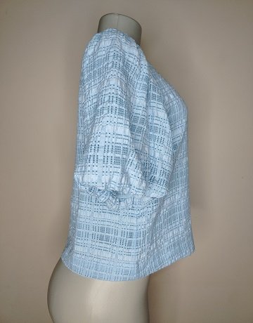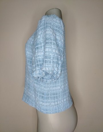 Light Blue textured short-sleeved blouse from Forever New. Size – UK8. Bubble sleeves. Textured check pattern. High rounded neckline. Cropped length. Back keyhole closure. Viscose/Cotton fabric mix. Lined. Garment is in excellent condition.