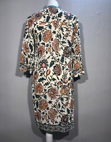 G Couture dress. White, green, pink and brown colouring. Patterned. V-Neck. 100% Rayon fabric. Good condition.