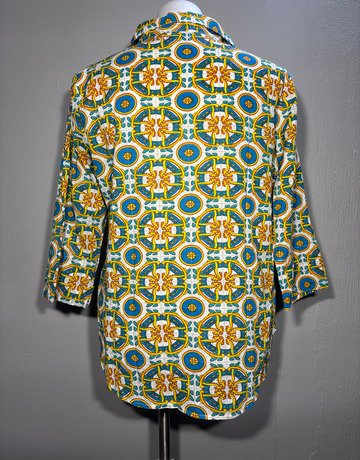 Giacomo Ginque shirt. White, blue, yellow, orange and green colouring. Patterned. Closes with buttons along the front of the top. 100% Cotton fabric. Good condition.