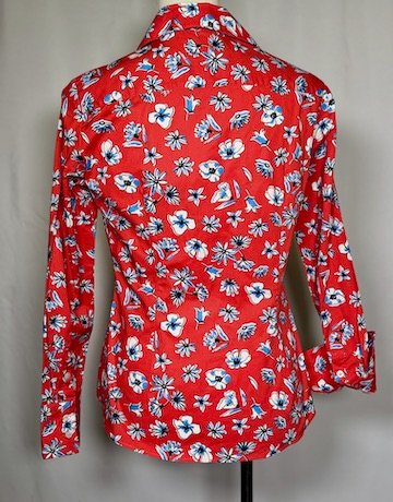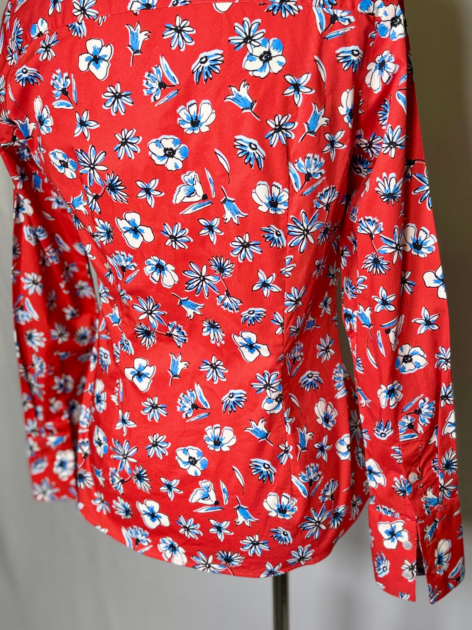 This vibrant red shirt features a playful floral pattern with shades of blue and white, perfect for adding a pop of color to your wardrobe. The fitted design and button-up style make it a versatile piece for both casual and semi-formal occasions.