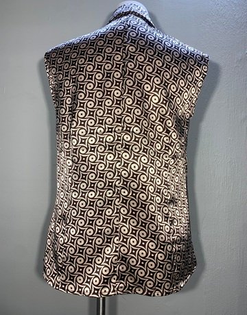 Jo Borkett shirt. Brown and white colouring. Patterned. Closes with buttons along the front of the shirt. Has a collar. Good condition.