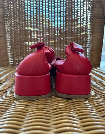 Jones pumps. Red colouring. Has bows on the front of the pumps. Has a rounded, closed toe. Good condition.