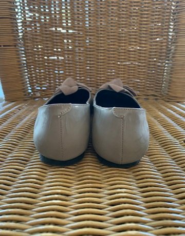 Kurt Geiger pumps. Brown/grey colouring. Has a closed, rounded toe. Has a knotted flower detail on the front of the shoe. Good condition.
