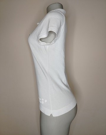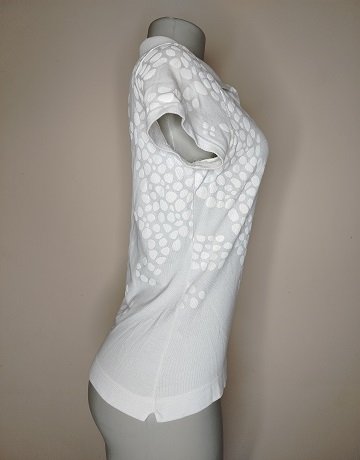 White Cotton “Plastic Polo” Michael Young x Lacoste Golf Shirt. Size – Smal. lCollared and Buttoned front placket. Short sleeved. 100% Cotton. Lacoste logo. Applied plastic crocodile pattern. Collectors item in New condition.