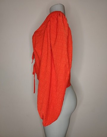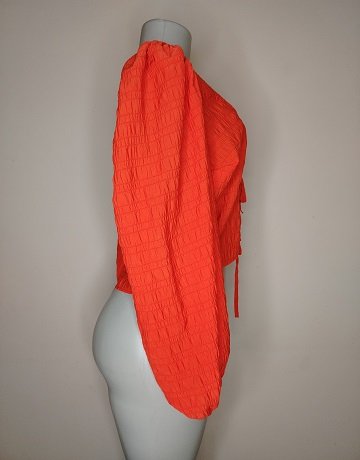 Orange Texture Fabric Top from Levi’s.  Size – Medium. Long, puffy sleeves with elasticate wrist. Boxy and Cropped. Three Fabric Tie closure in front. Deep, scooped neckline. Polyester fabric. Garment is in excellent condition.