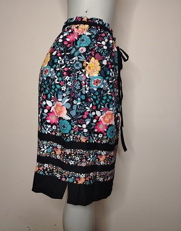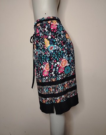 Floral print skirt from Loft. Size – Medium. Black background with a vibrant, multicoloured floral pattern. Drawstring waist. Elasticated waistband. Black and Floral banded hemline. Two in-seam pockets. Polyester fabric. Casual, comfortable skirt in excellent condition.