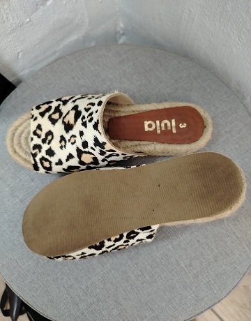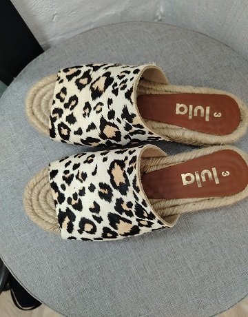 Saint Leather slip-on Espadrilles from Lula. Size – UK3. Leopard print. Open-toe slip-on sandal with a wide strap and espadrille-style rope sole. Pony hair leather material. Sandals are in excellent condition.