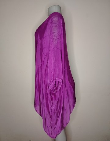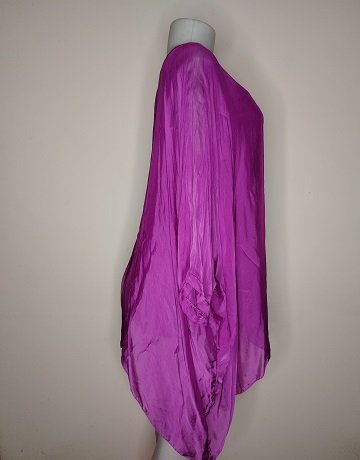 Magenta Pink Flowy Top from Made in Italy. Over-sized. Cut-on short sleeves. Scooped neckline. Lined. Silk/Viscose fabric mix. Garment is new with tags attached.