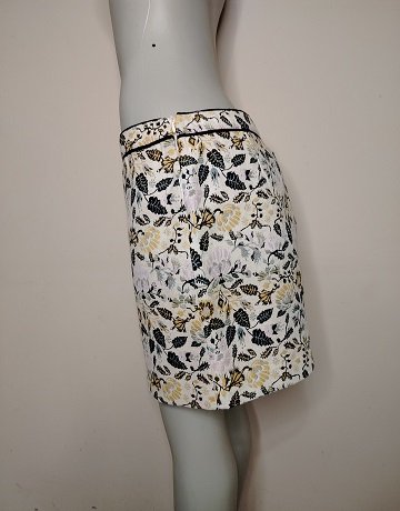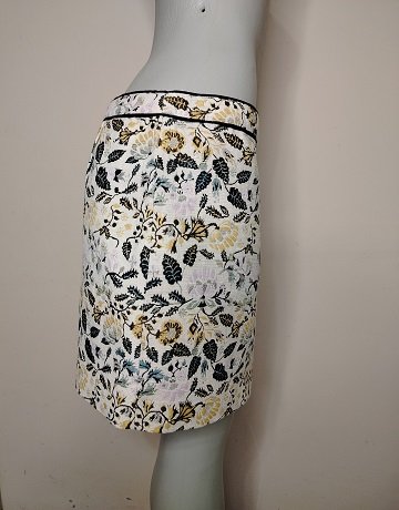 Multi-coloured Mini Skirt from Mango Casual. Size – EUR44/UK16. Tapestry like fabric. Polyester/Cotton fabric mix. Invisible zipper on the side. Mini length. Medium weight fabric. Yellow, Black and Grey Floral print on Cream. Garment is in great condition.