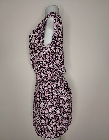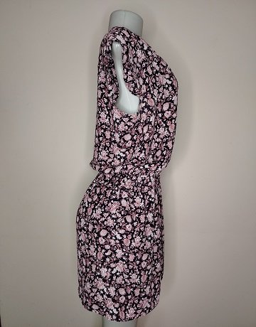 Floral print casual day dress from Mango. Size – Medium. V-neckline. Short sleeves. Elasticated waist. Viscose fabric. Pink and cream floral print on black background. Lined. Garment is in great condition.