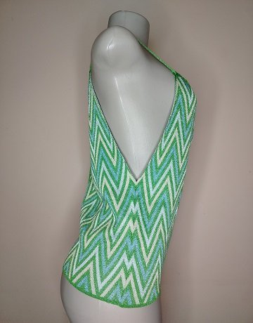 Green Metallic Chevront print Top from Mango. Size – Medium. Drawstring straps. Knitted Polyester/Viscose fabric. Cream, Blue and Green Chevron pattern. Garment is in greater condition.