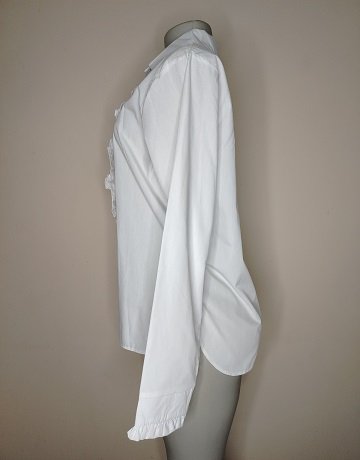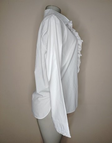 White Blouse from Massumi Collection. Size SA38/UK14. Ruffle front detail. Pearlised buttons. Long, cuffed sleeves with ruffle detail. Classic collar. Fitted. Curved hemline. Cotton fabric mix. Blouse is in excellent condition.