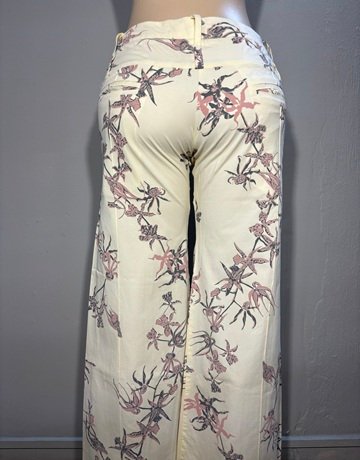 Maya Prass pants. Cream, pink and black colouring. Patterned. Closes with a zipper and buttons on the front of the pants. Has two pockets on the front and back of the pants. Good condition.