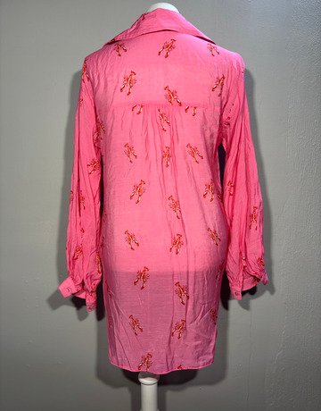 ME&B Pink shirt. Pink, orange, red and white colouring. Patterned. Closes with buttons along the front of the top. 86% Rayon fabric. Good condition. Light weight.