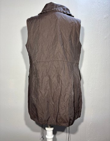 Meuse jacket. Brown colouring. Closes with a zipper along the front of the jacket. Sleeveless. Good condition.