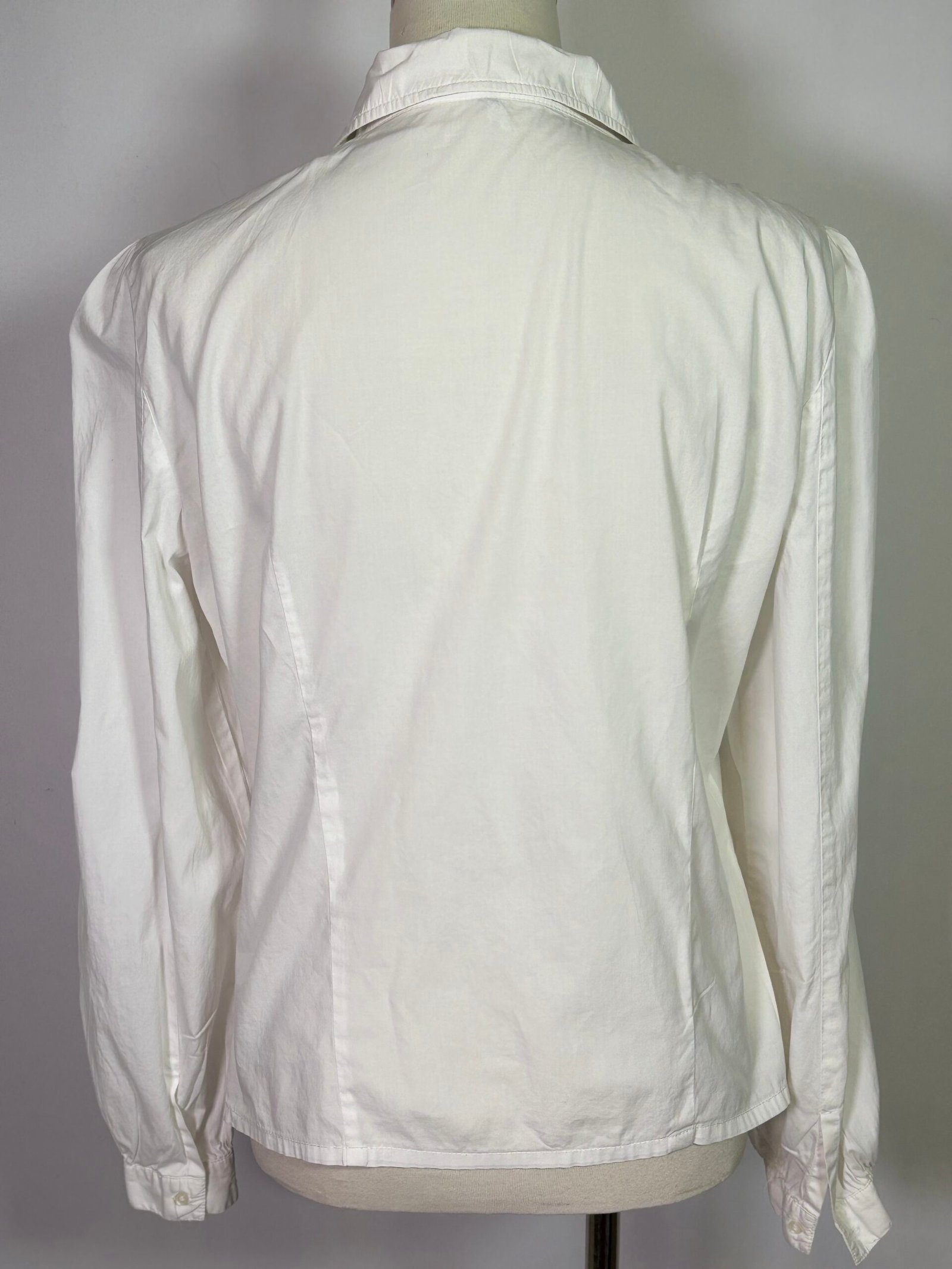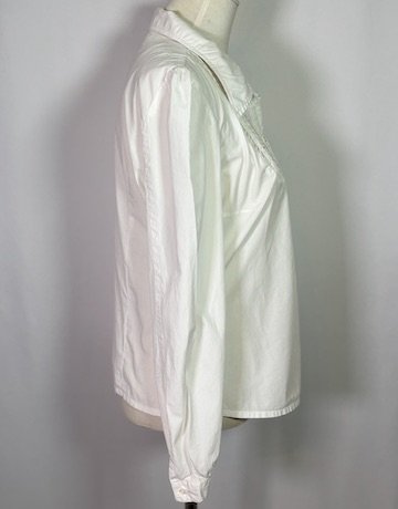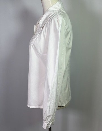 Elegant white blouse featuring delicate detailing and puffed sleeves, perfect for any occasion.