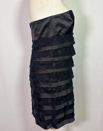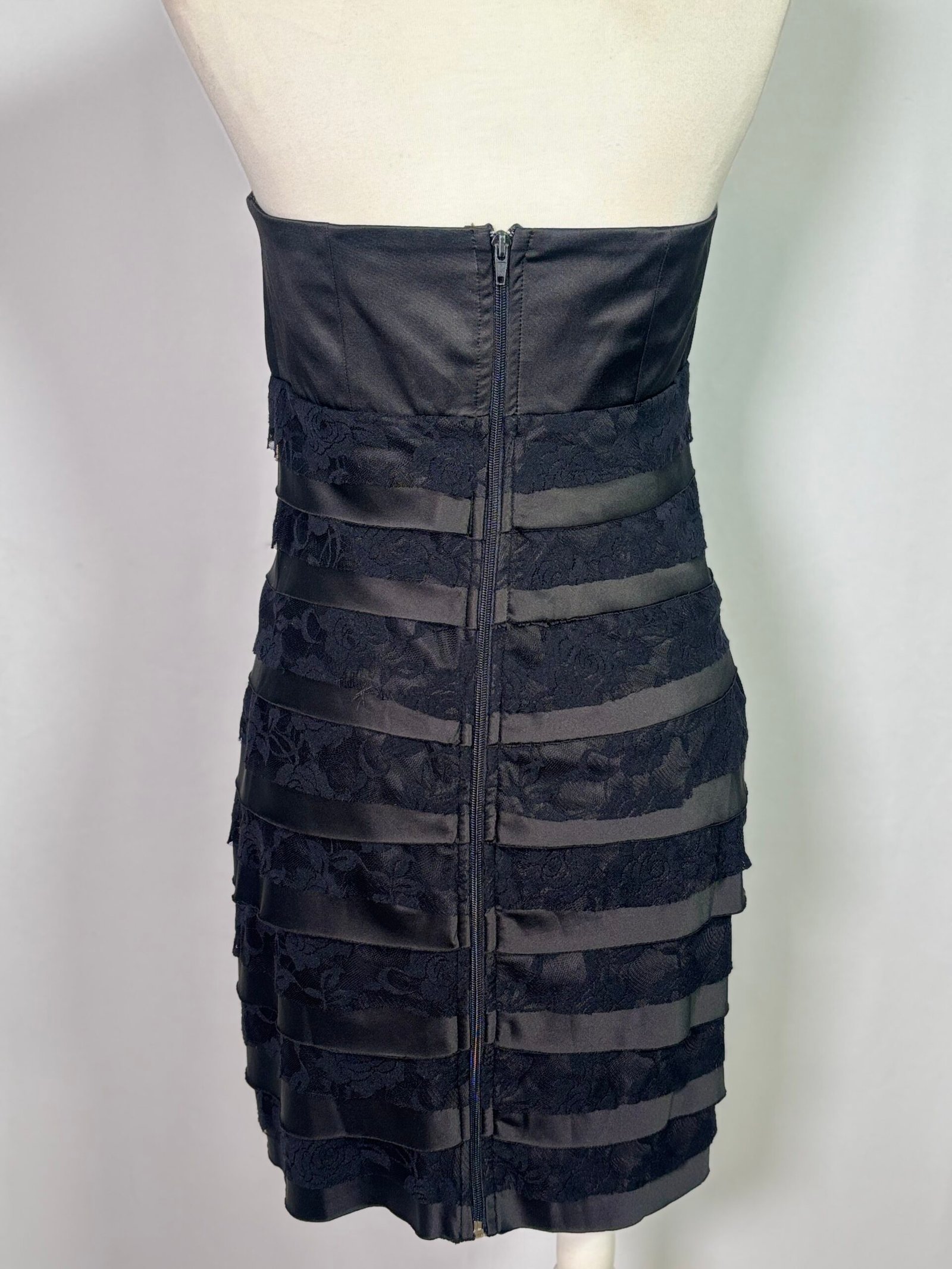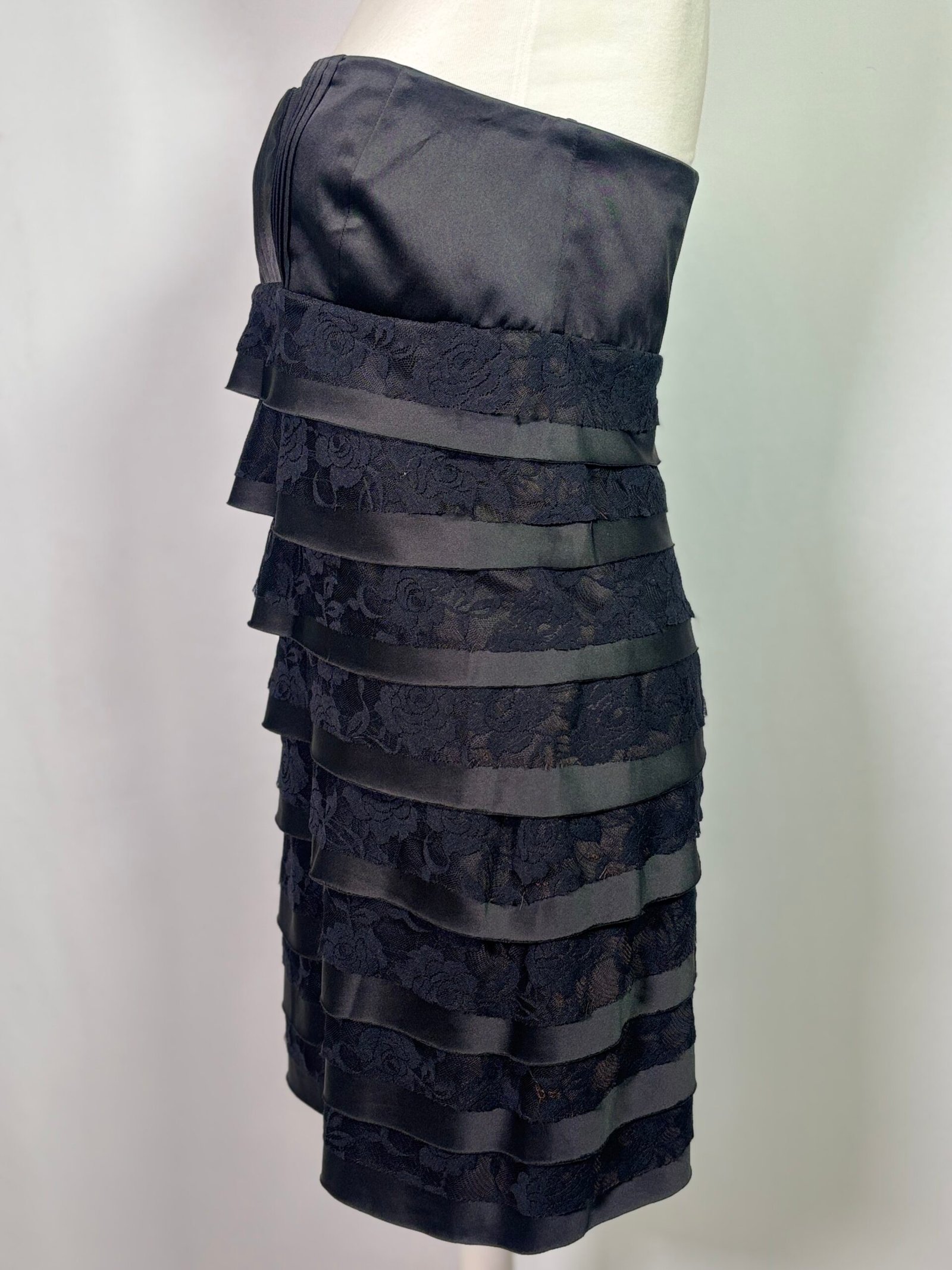 Chic strapless dress featuring a layered design, perfect for evening events or special occasions.
