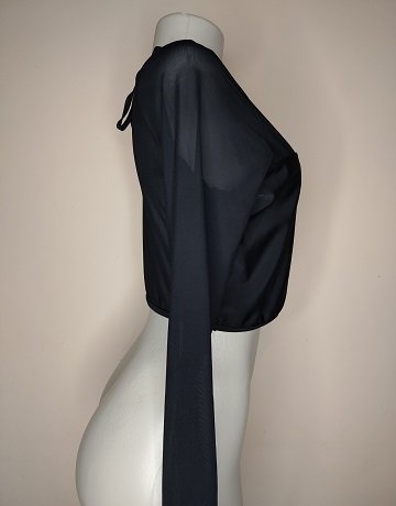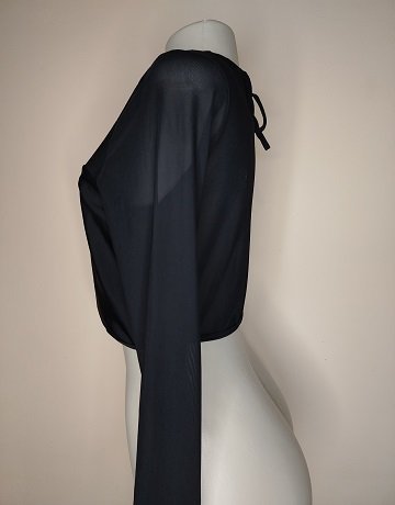 Black Lycra Cropped Rashguard Top from Piha, New Zealand.  Size – UK16. Long, Mesh sleeves. Elaticated hem. Mesh bodice insert. Round neckline with fabric tie at the back. Garment is new with tags.