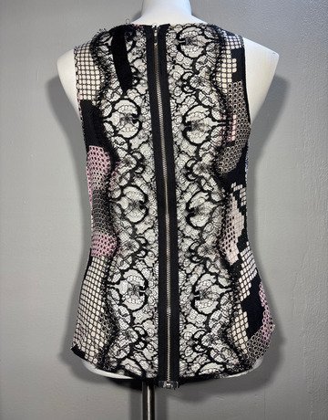 Poleci top. Black, white and pink colouring. Closes with a zipper along the back of the top. Has lace detailing. Sleeveless. 100% Silk fabric.