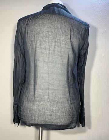 Polo top. Black colouring. Closes with buttons along the front of the top. 100% Cotton fabric. Sheer. Good condition.