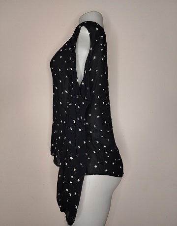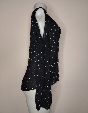 Black Button-through Blouse from Reformation, USA. White scattered Star print. Cold-shoulder style. Long sleeves with elaticated wrist. Shaped hemline. Sheer Viscose fabric. Made in the USA. Feminine garment in great condition.