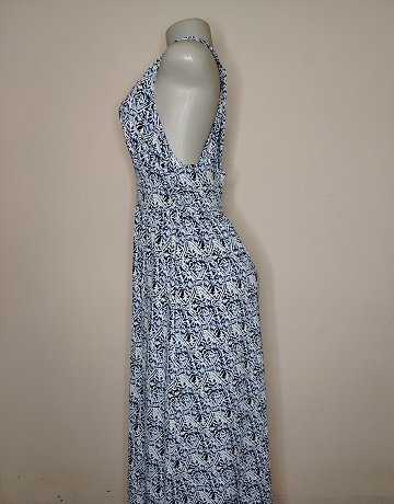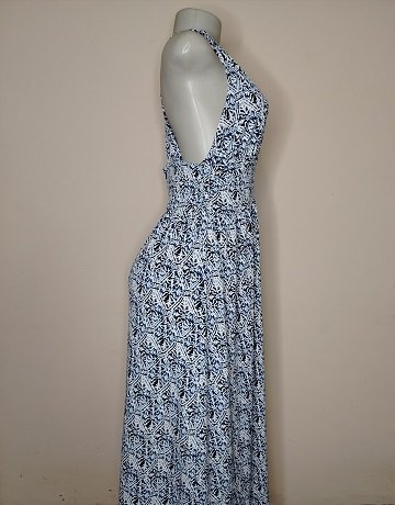 Blue and White Maxi Dress from Romeo & Juliette. Size – Medium. Cross-over front bodice. Halterneck. Waistband. Stretchy, knit fabric. Floor length. Scroll print. Lovely summer dress in excellent condition.