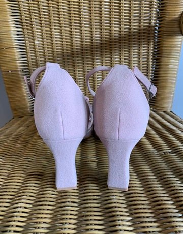Dusty pink T-strap bow detail sandals with a square toe design and block heel. Adjustable ankle strap with buckle strap. Suede finish. Condition new.
