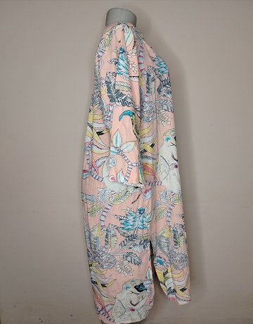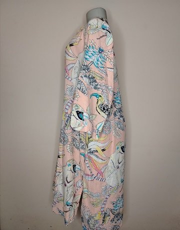 Pale Peach Dress from Solo, Cape Town. Size – Large. Kaftan style. Loose fitting. Tropical animal and plant print. Cotton fabric. Three quarter length sleeves. Side slits. Midi length. Round neckline with front button placket. Stunning dress in great condition.