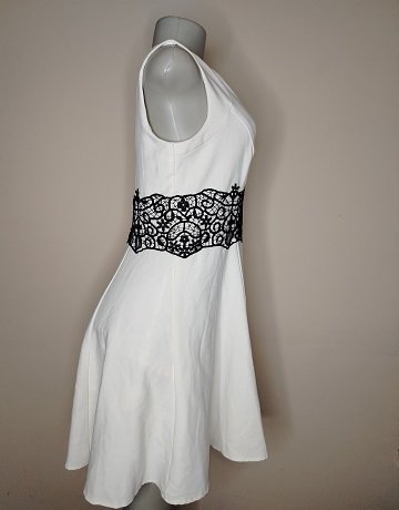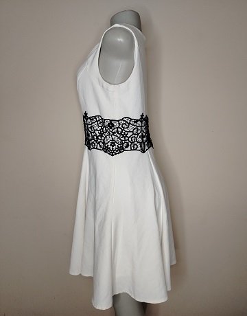 Cream and Black Dress from Star by Julienmacdonald for Debenhams. Size – UK12. V-shaped neckline. Sleeveless. Zipper centre back. Lined. Black Lace Waist inset. Princess seam Bodice. 8-Gore skirt. Feminine formal day-dress in goood condition.